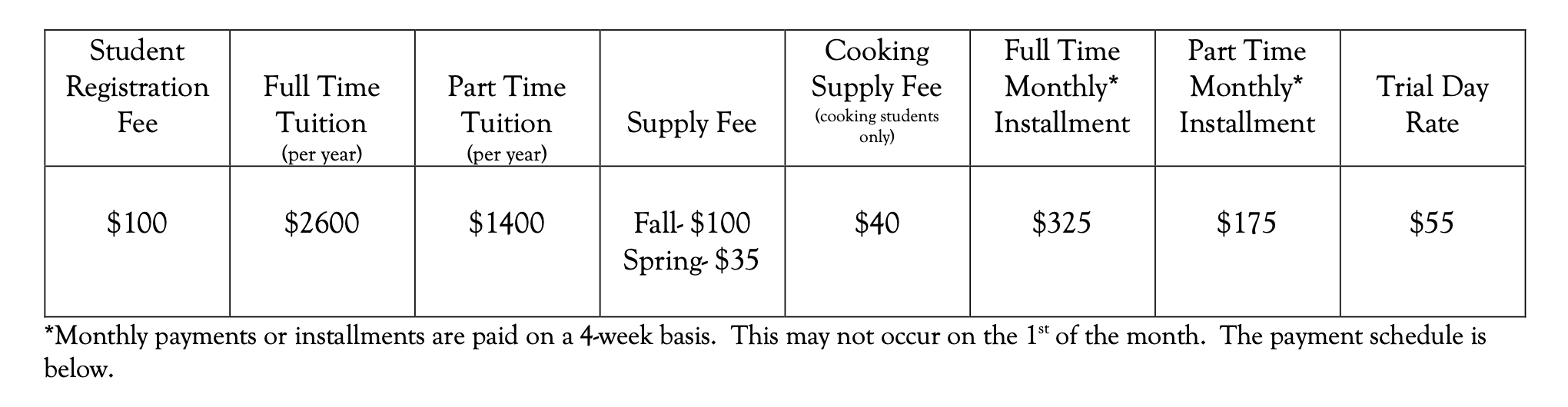 Monthly tuition payments are due every four weeks. We ask for your help in paying your tuition promptly as it is extremely embarrassing and uncomfortable for us to have to track down payments. We have a sign posted at the check in table displaying payment due dates.